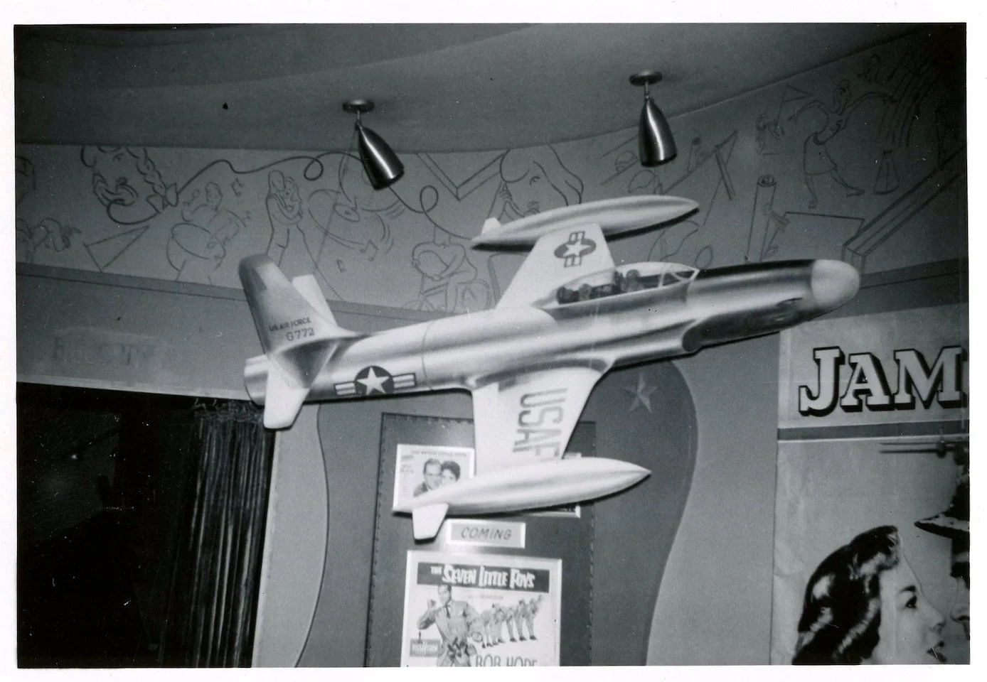 Photo Credit: Card-board cut-out display for the movie "Strategic Air Command" starring James Stewart and June Allyson of an airplane. Display is hanging from the ceiling of the interior of the Leachman Theater. 1955.
